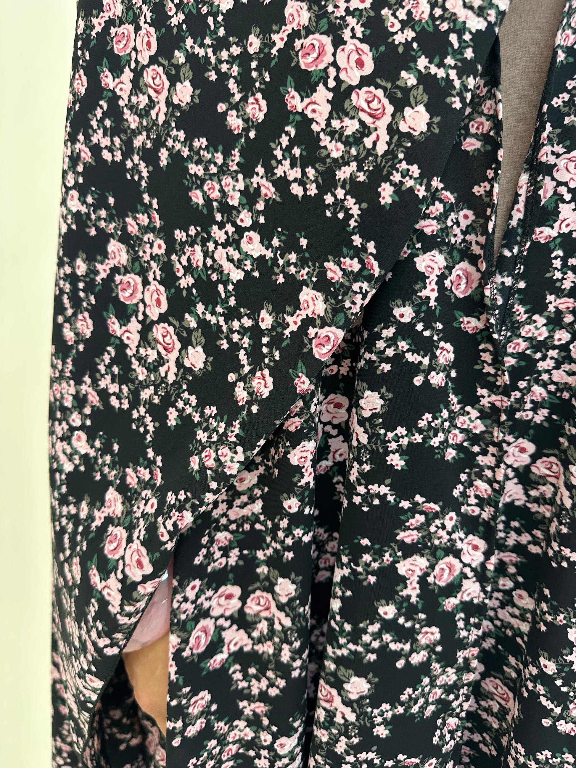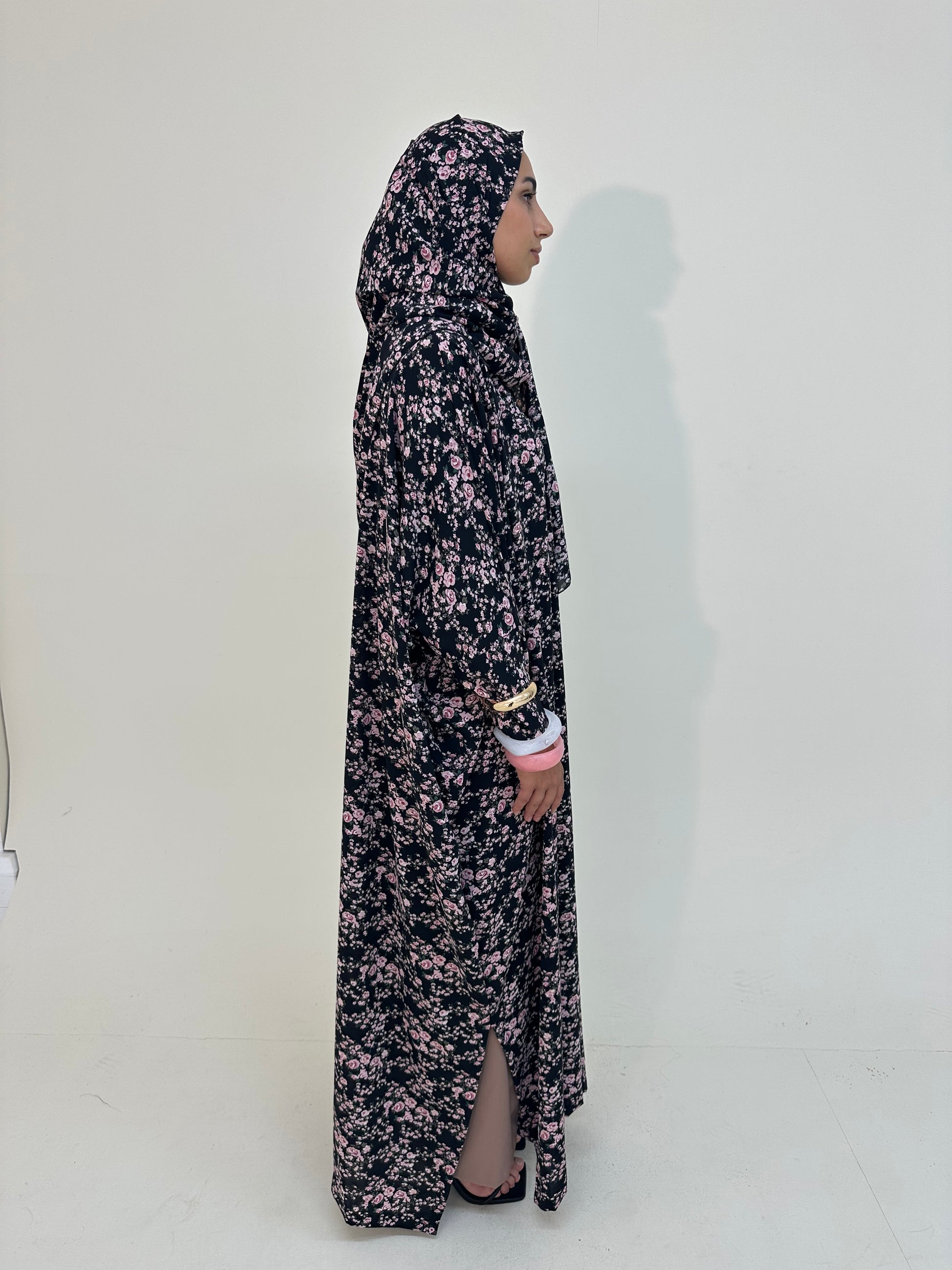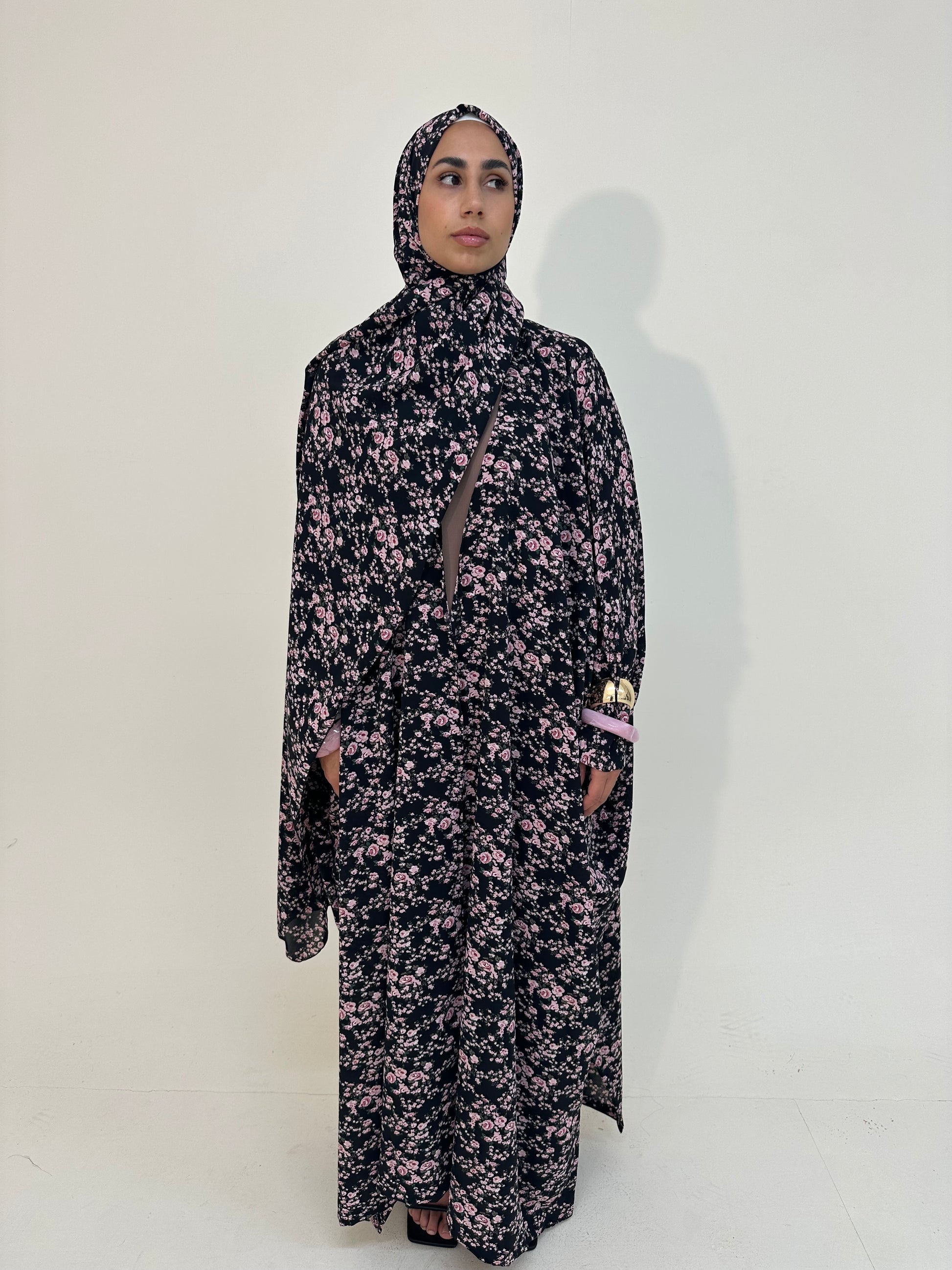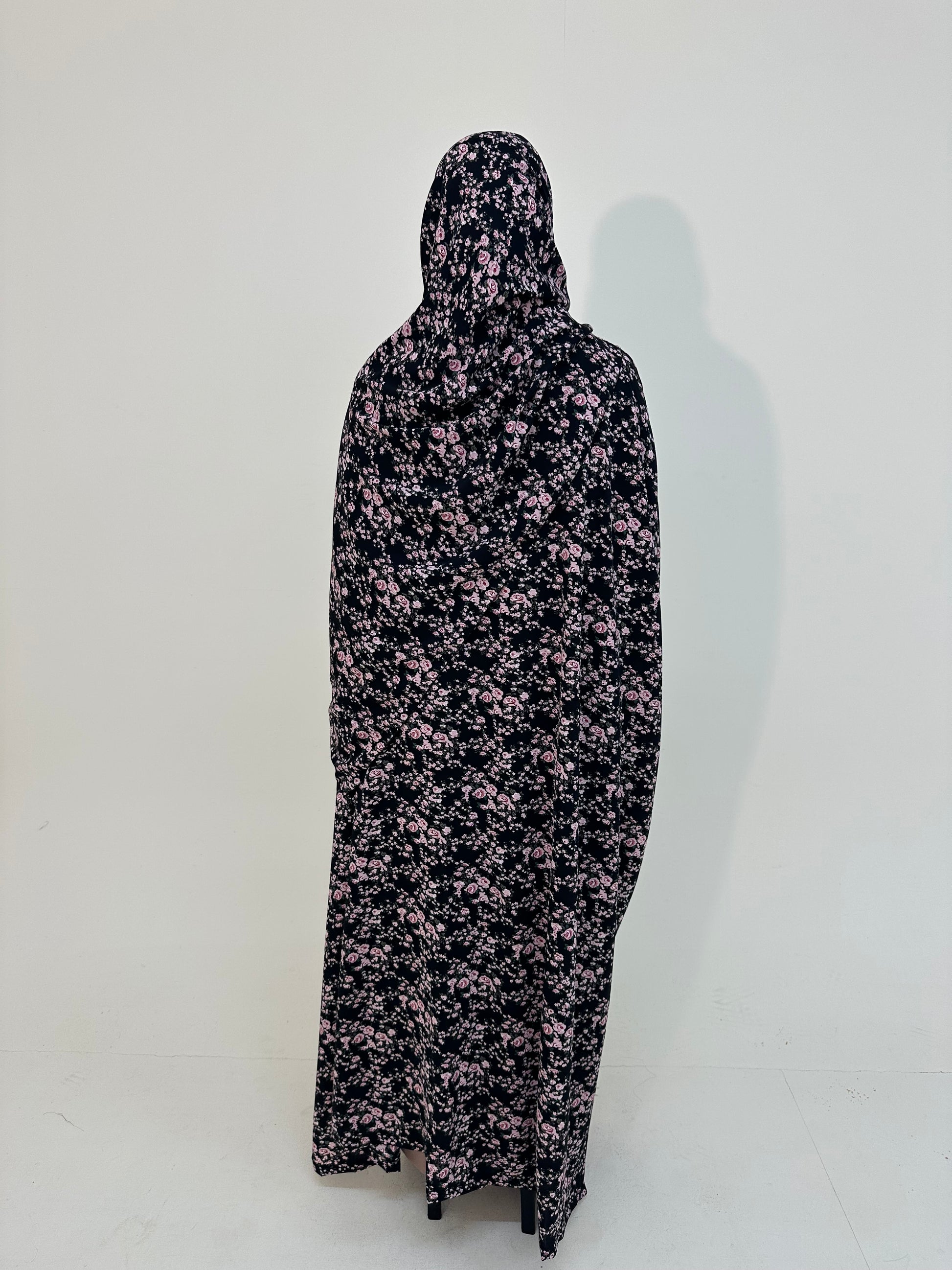 ● BLACK WITH PINK FLORAL PRINT 2 PIECE ABAYA SET