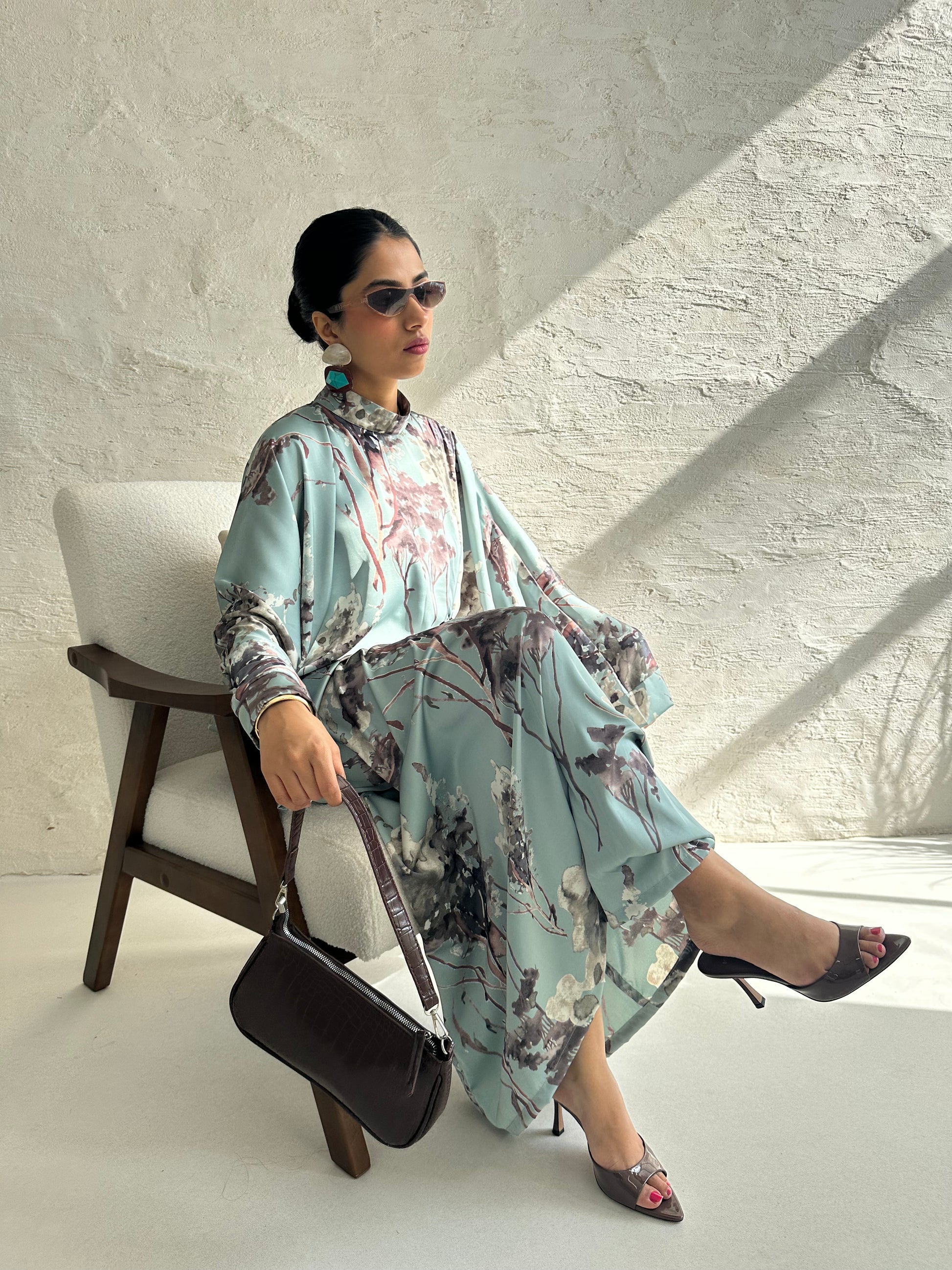 - BABY BLUE FLORAL PRINTED SILKY FEEL KAFTAN
