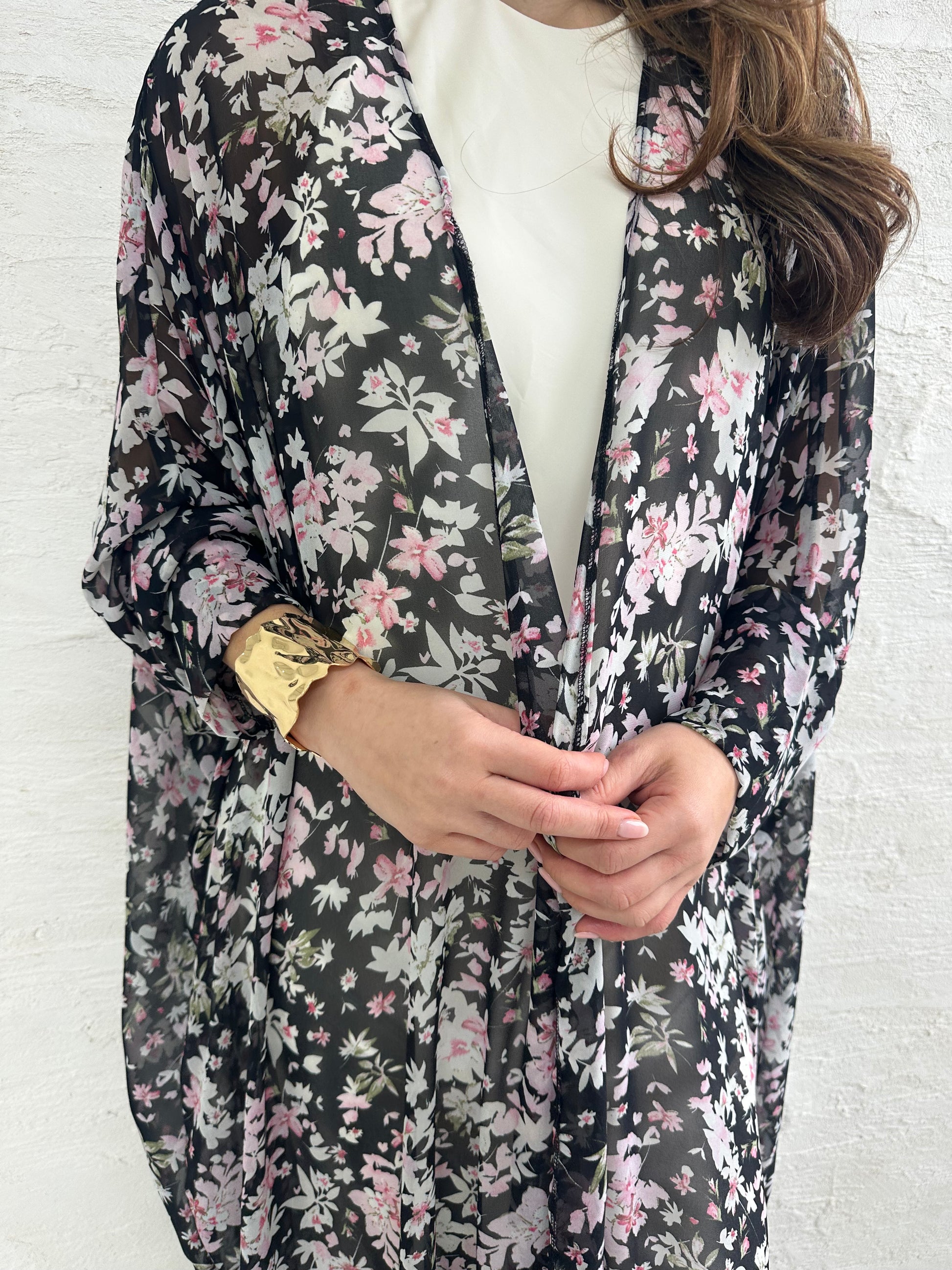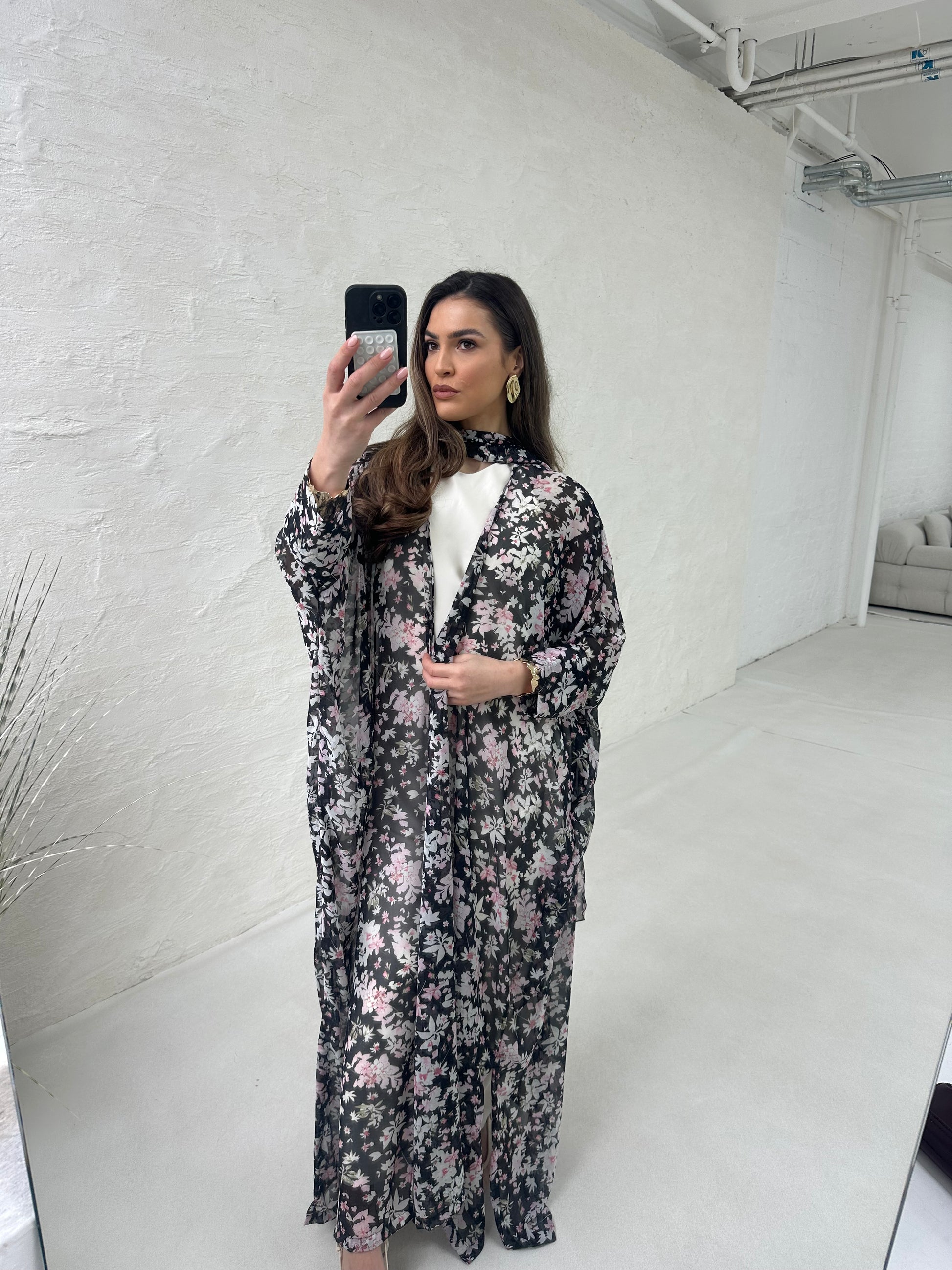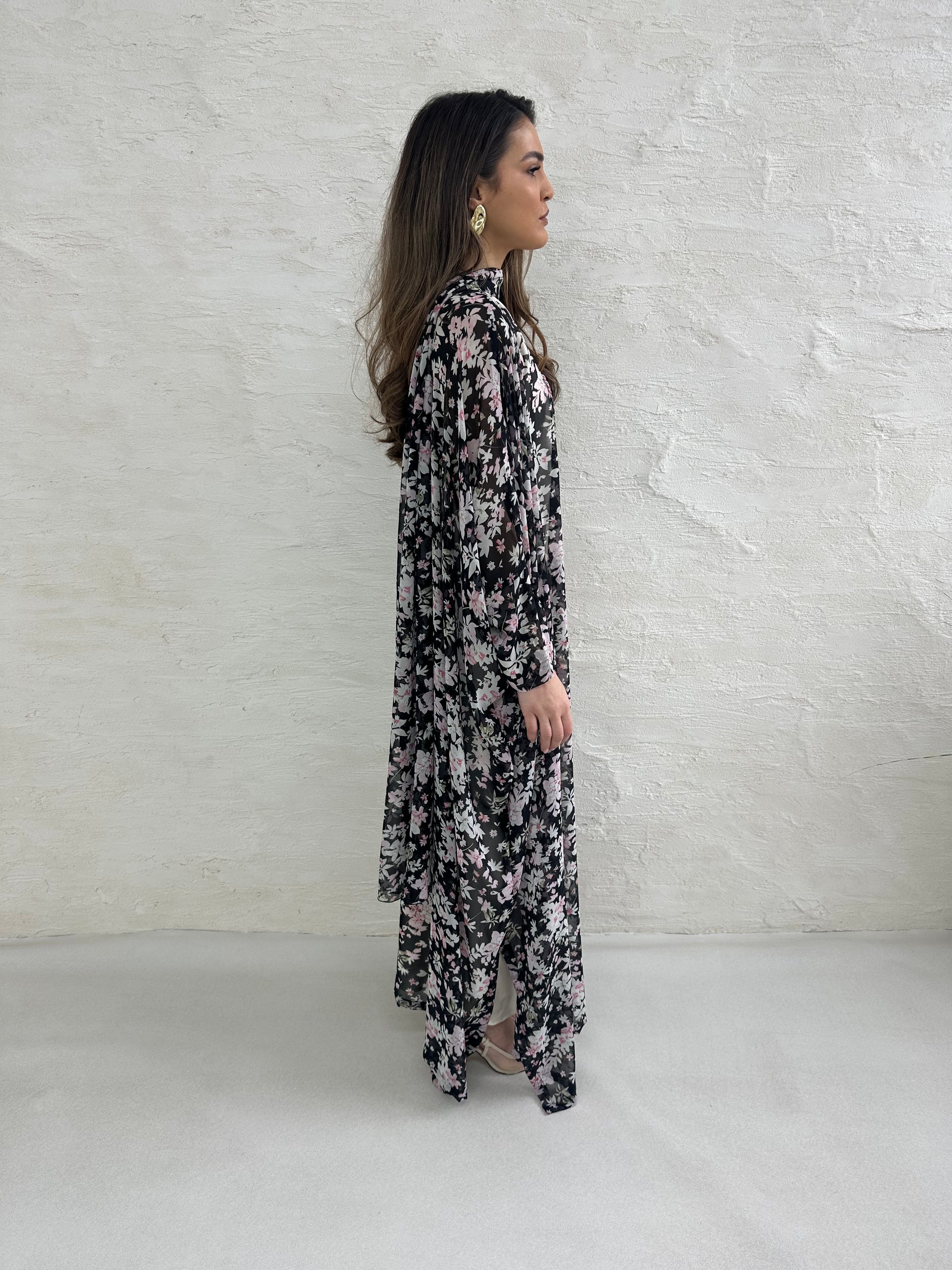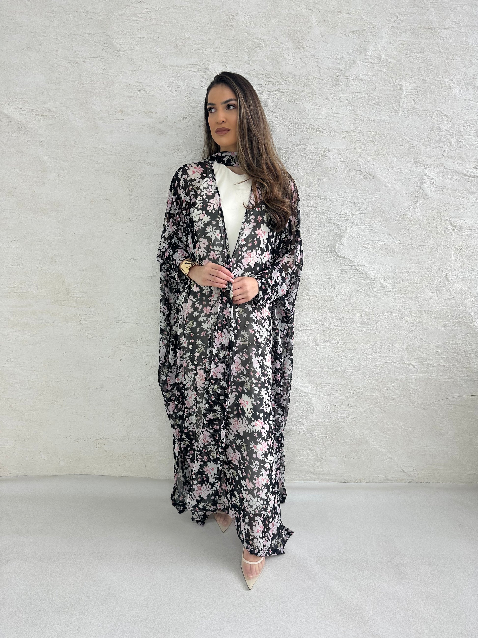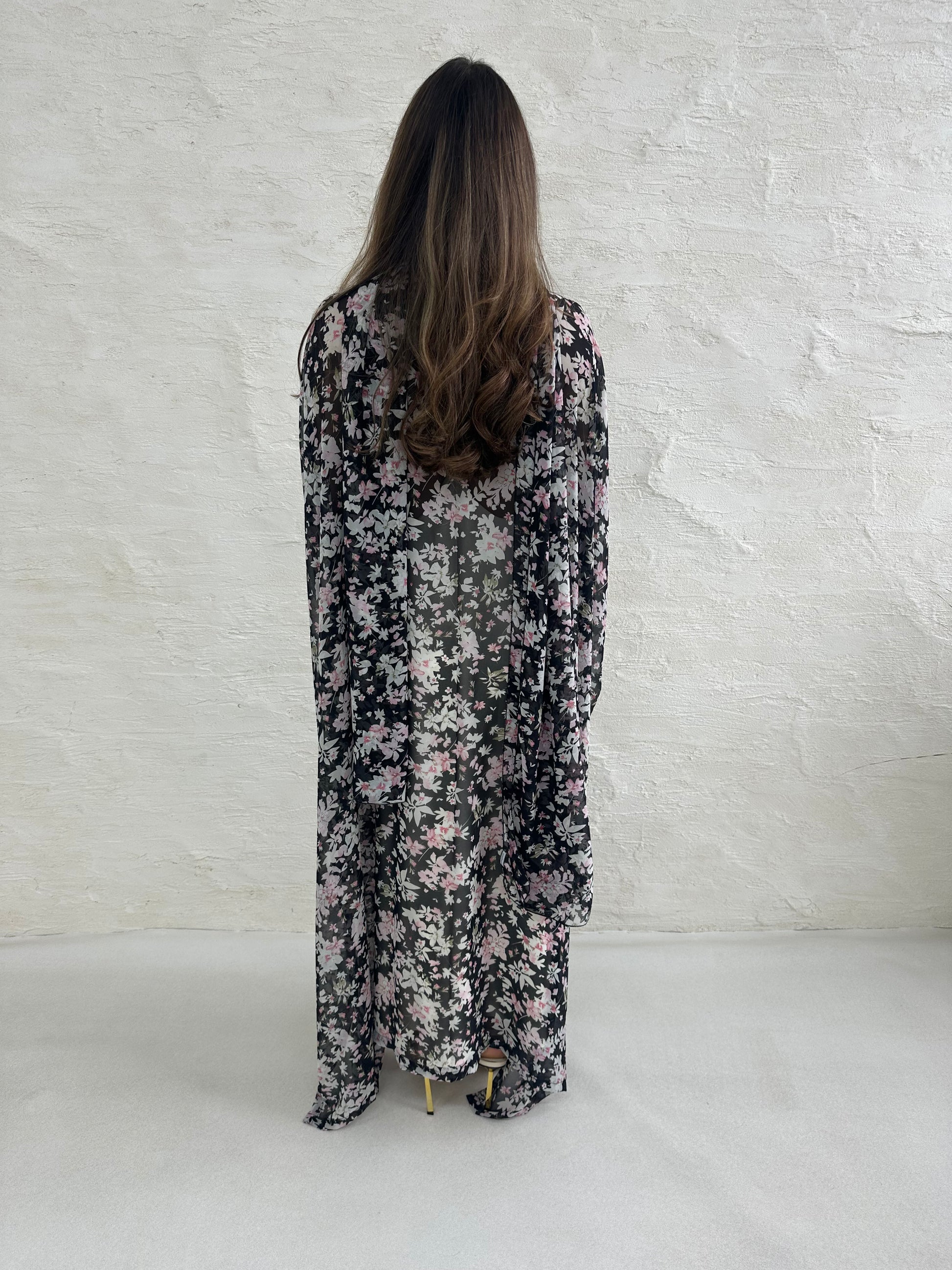 ● BLACK AND PINK SHEER CHIFFON FLORAL PRINTED 2 PIECE ABAYA SET