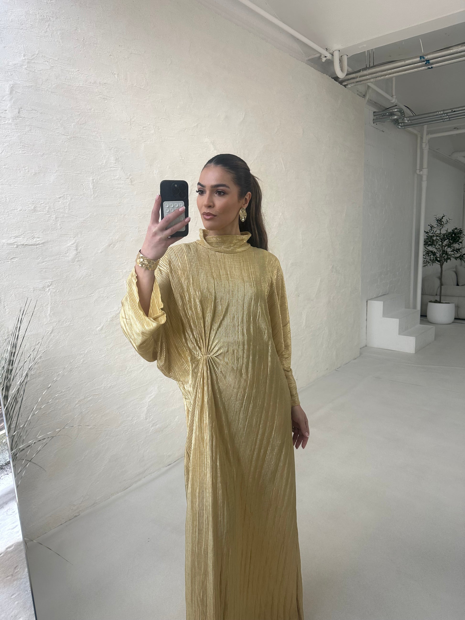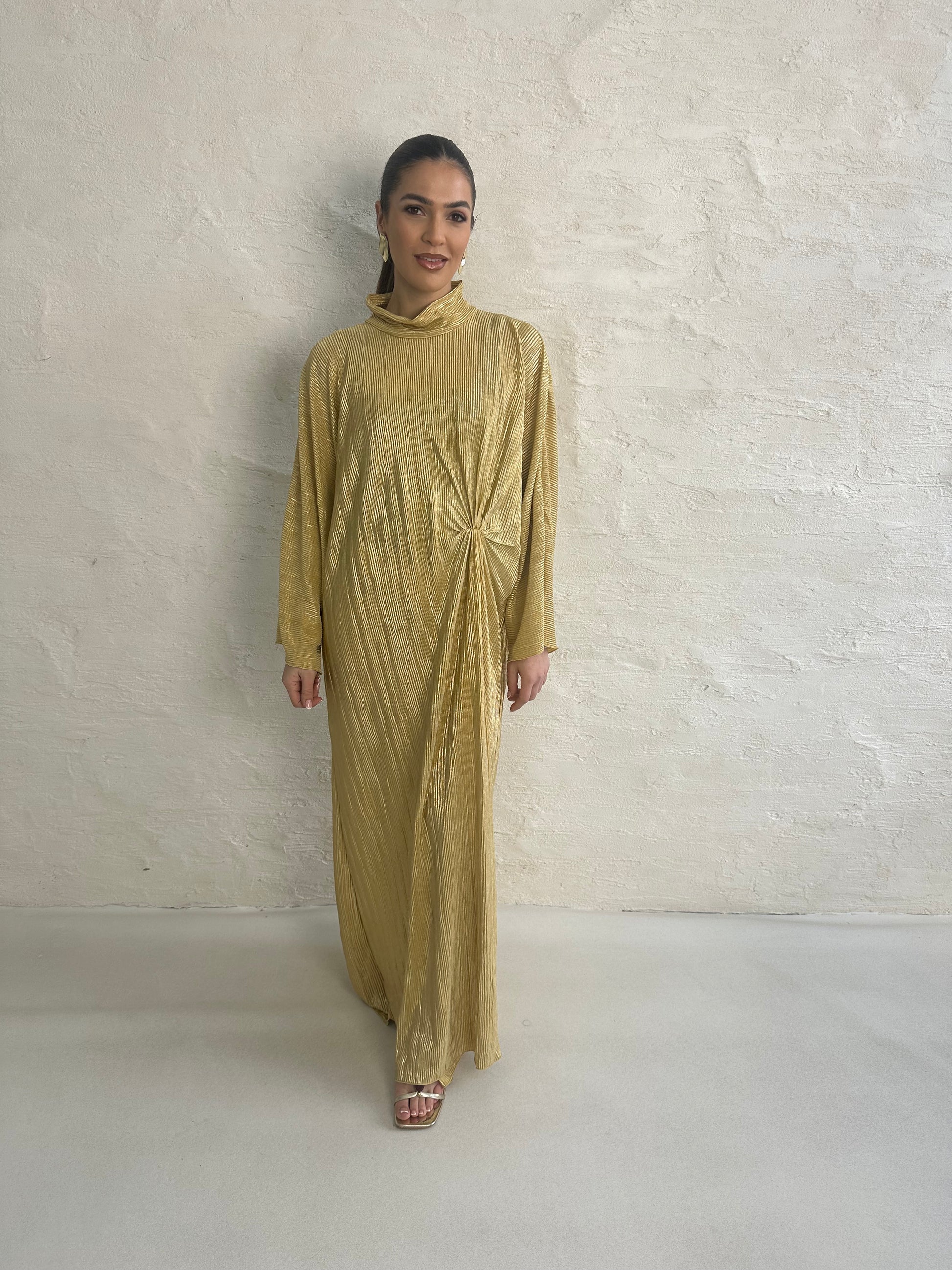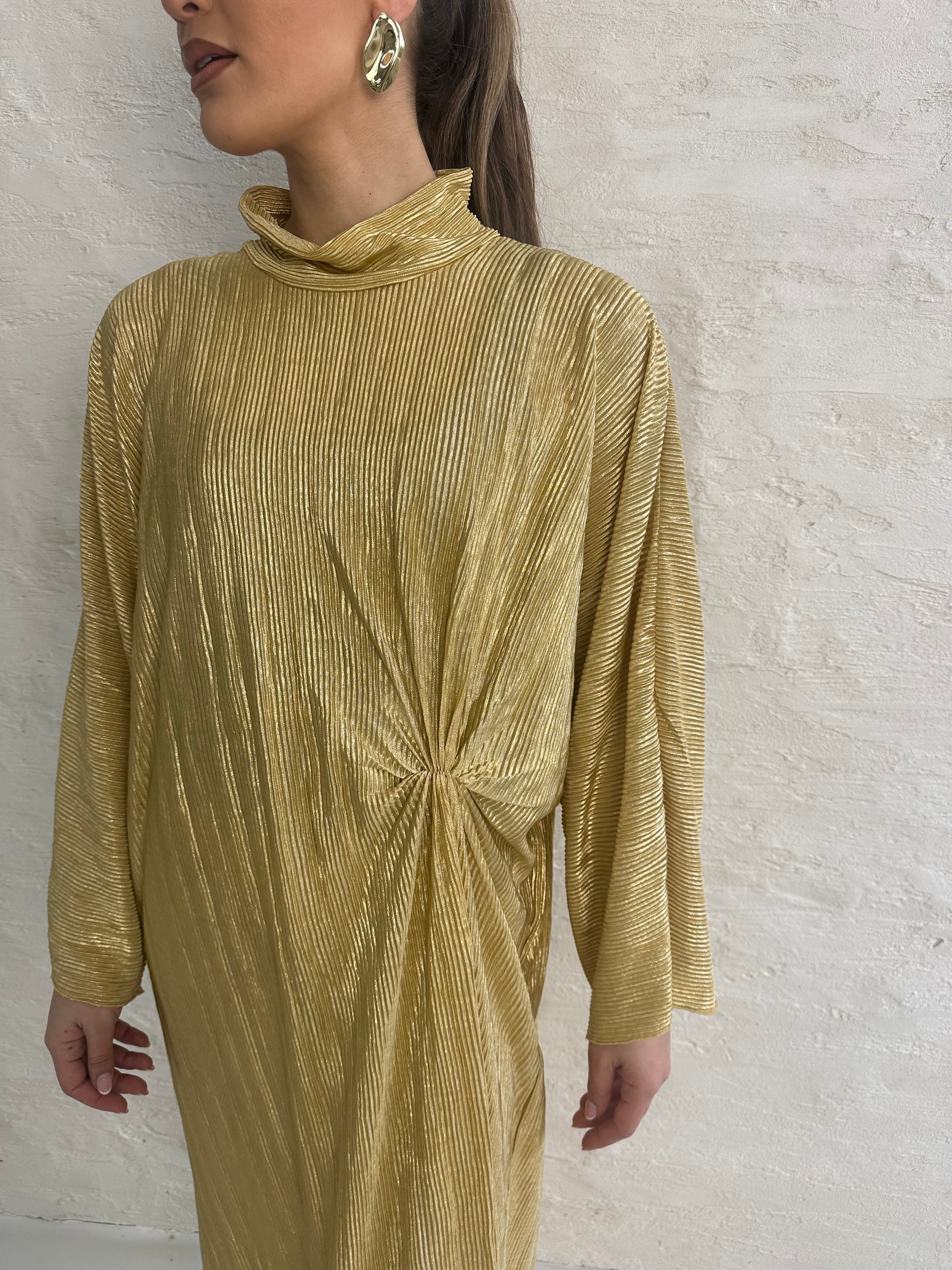 ● METALLIC LEMON PLISSE KNOT DRESS