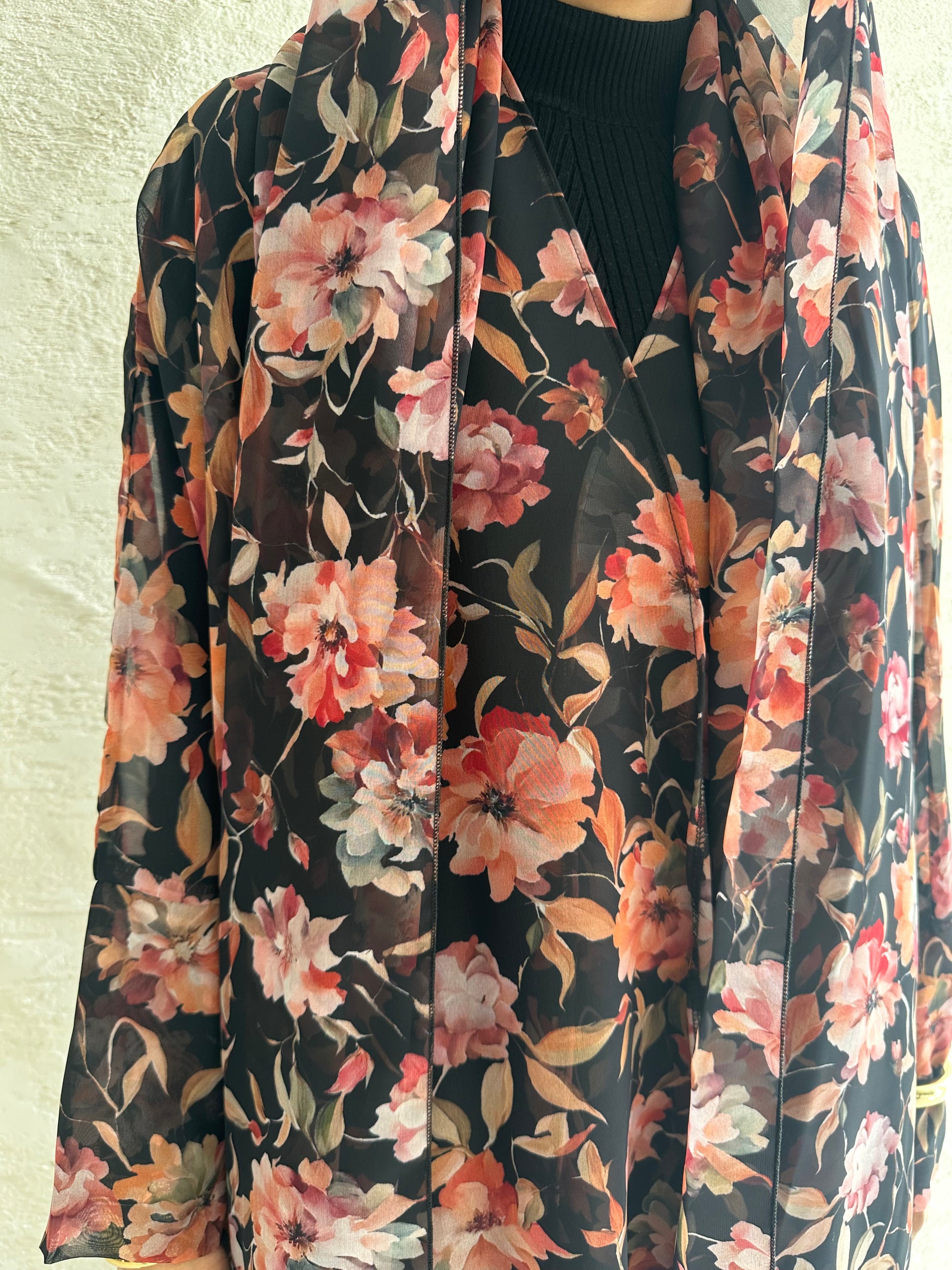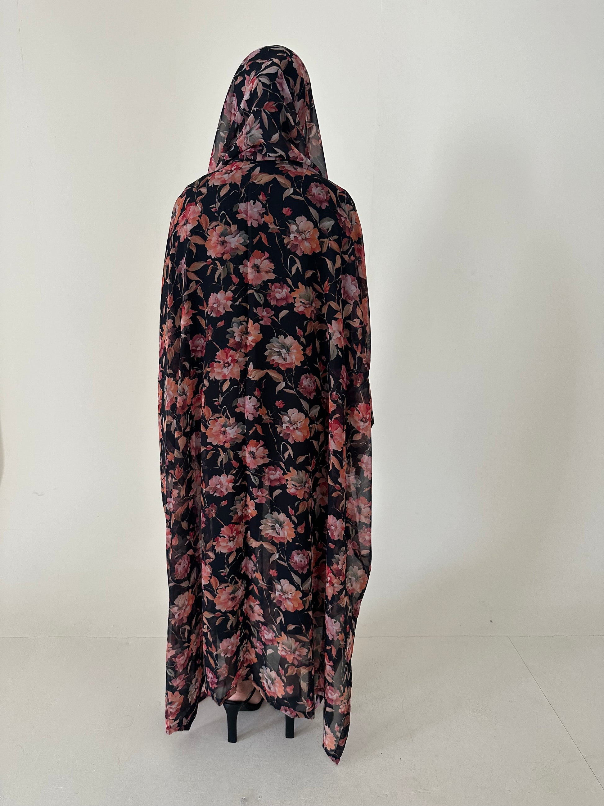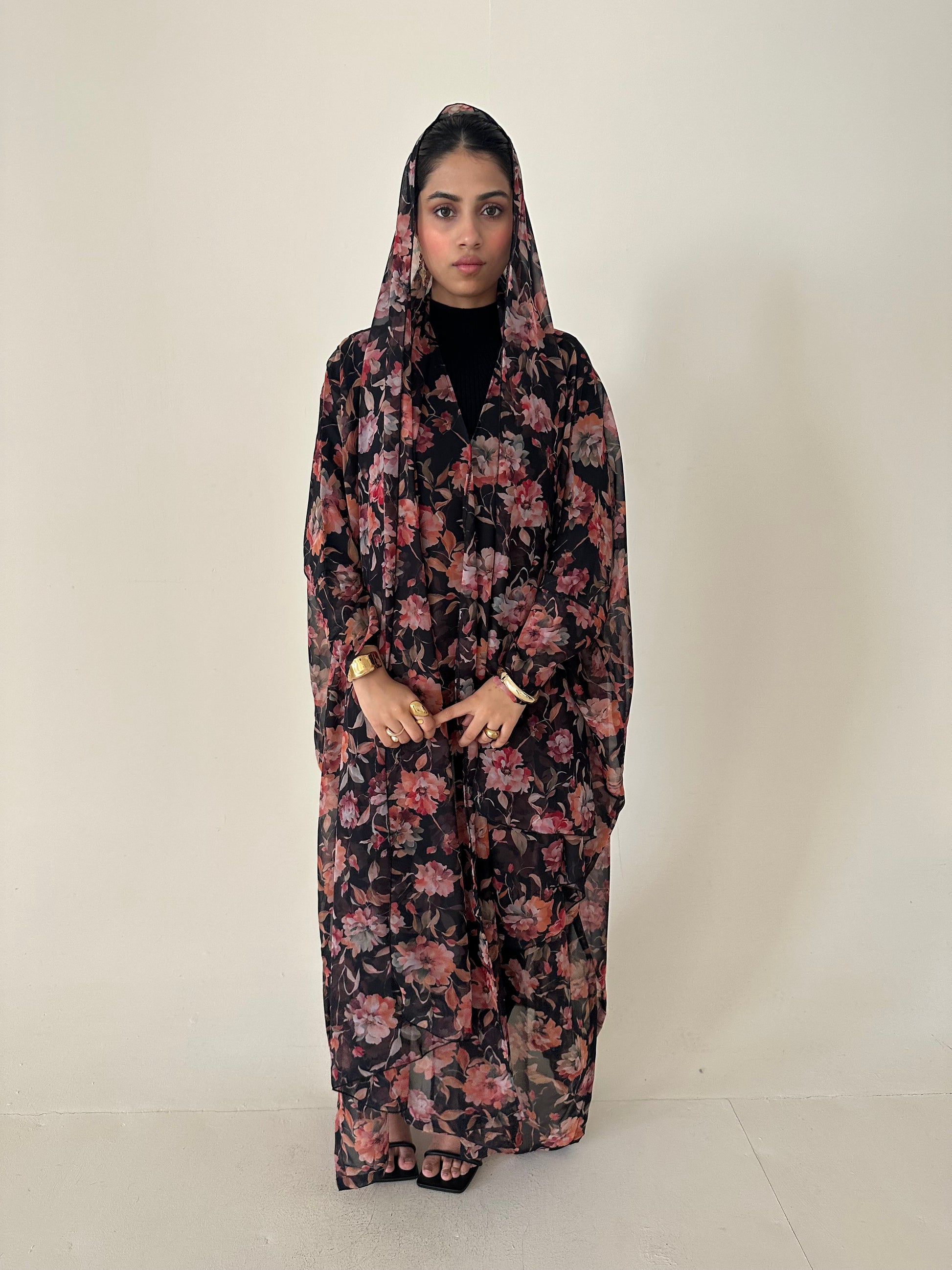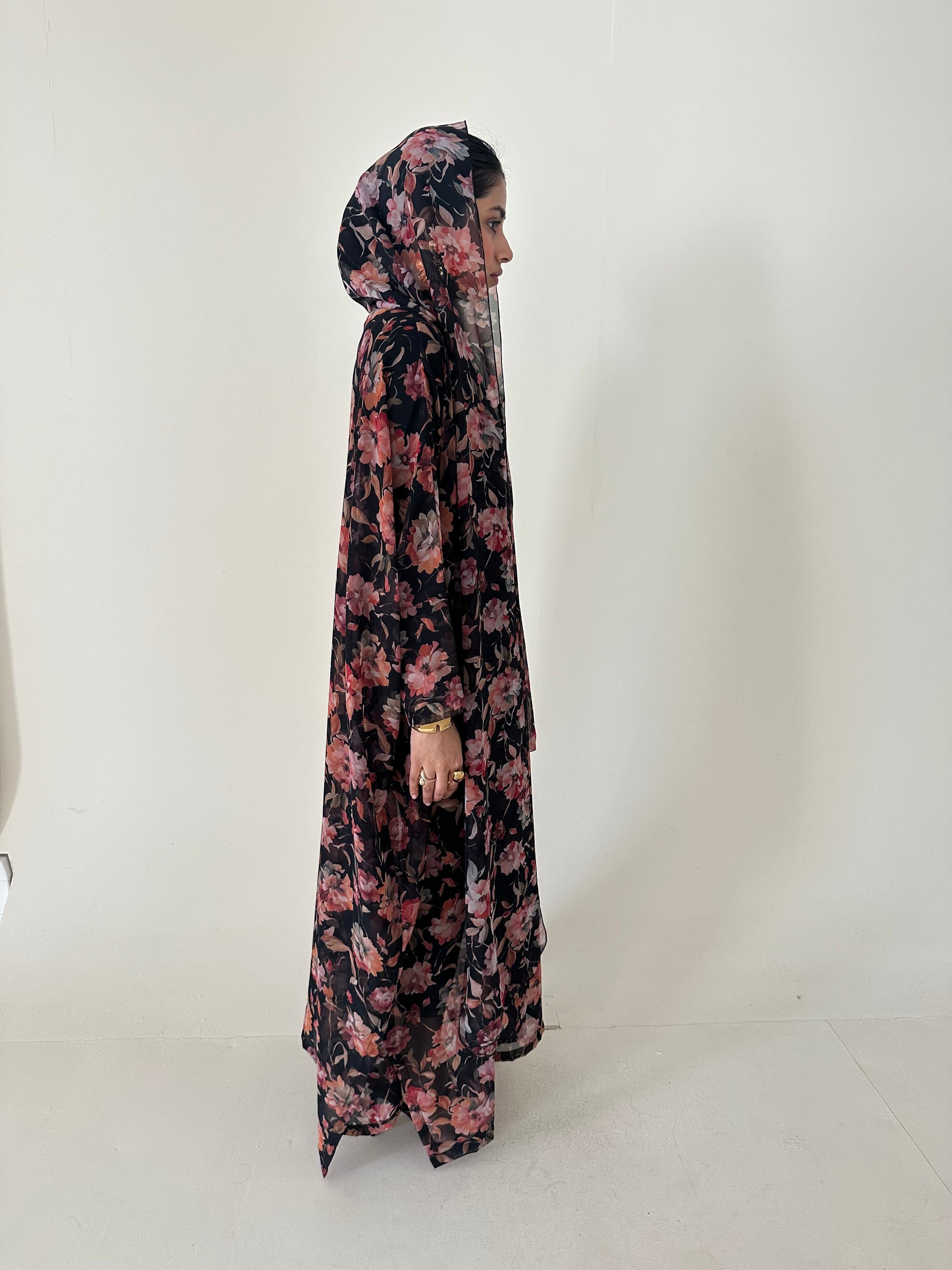 ● SOFT FLORAL PRINTED BLACK AND PINK 2 PIECE ABAYA SET