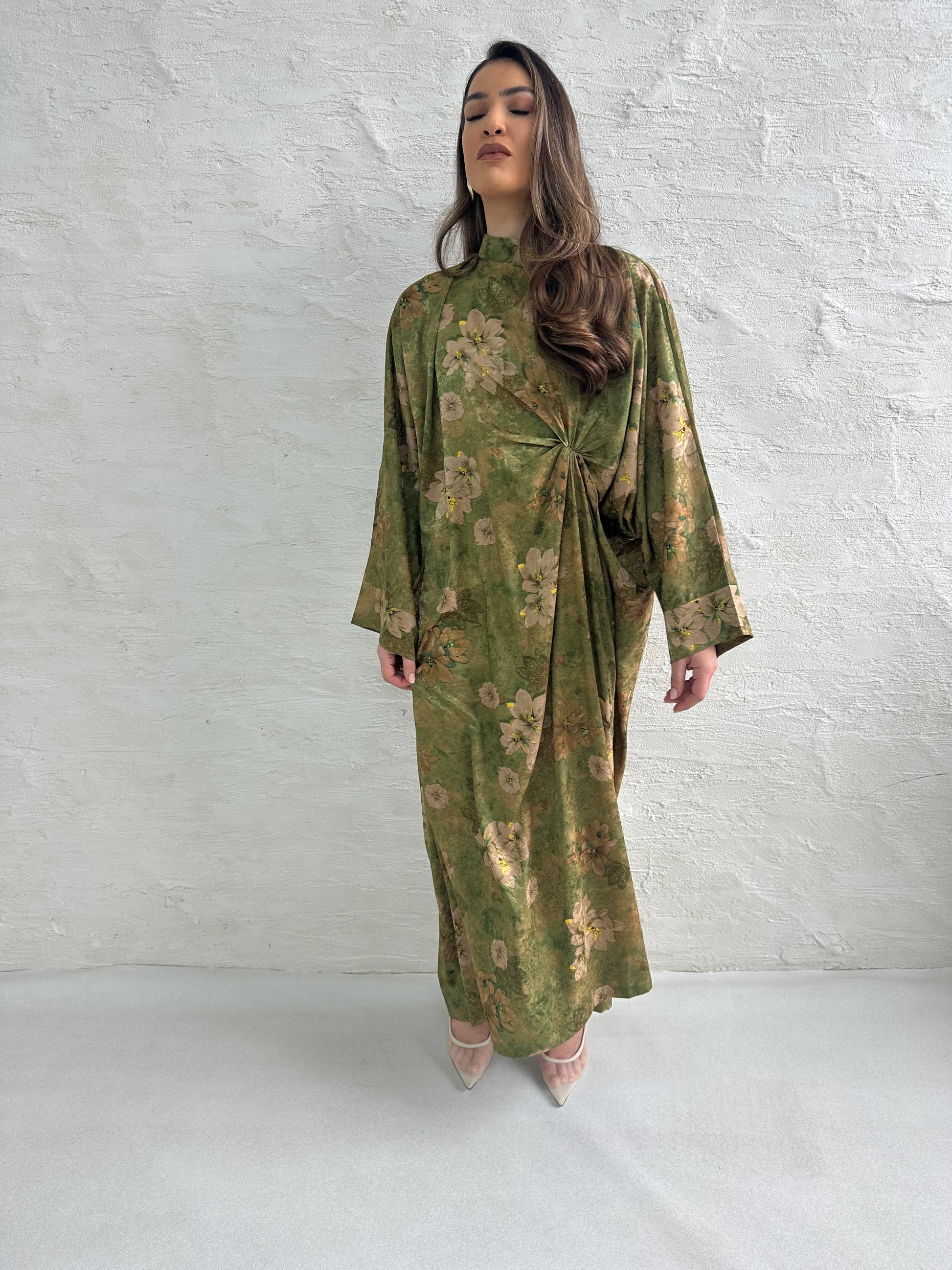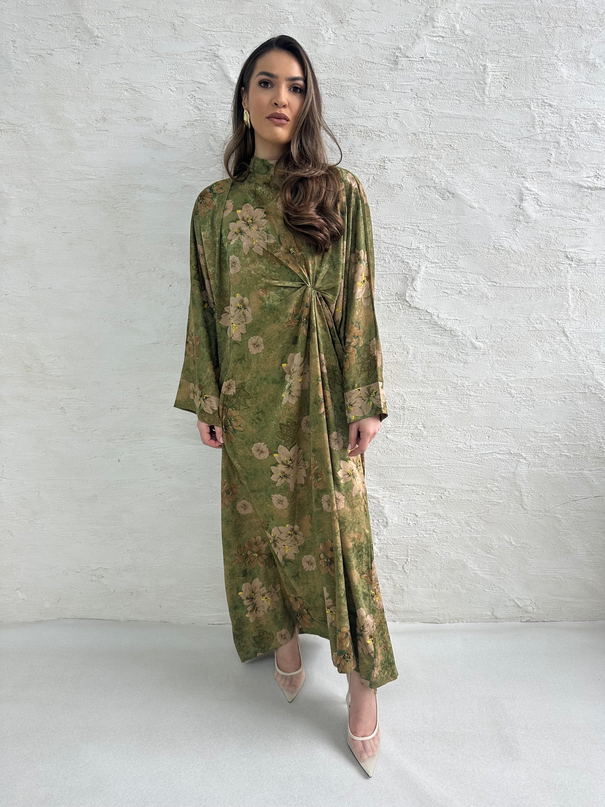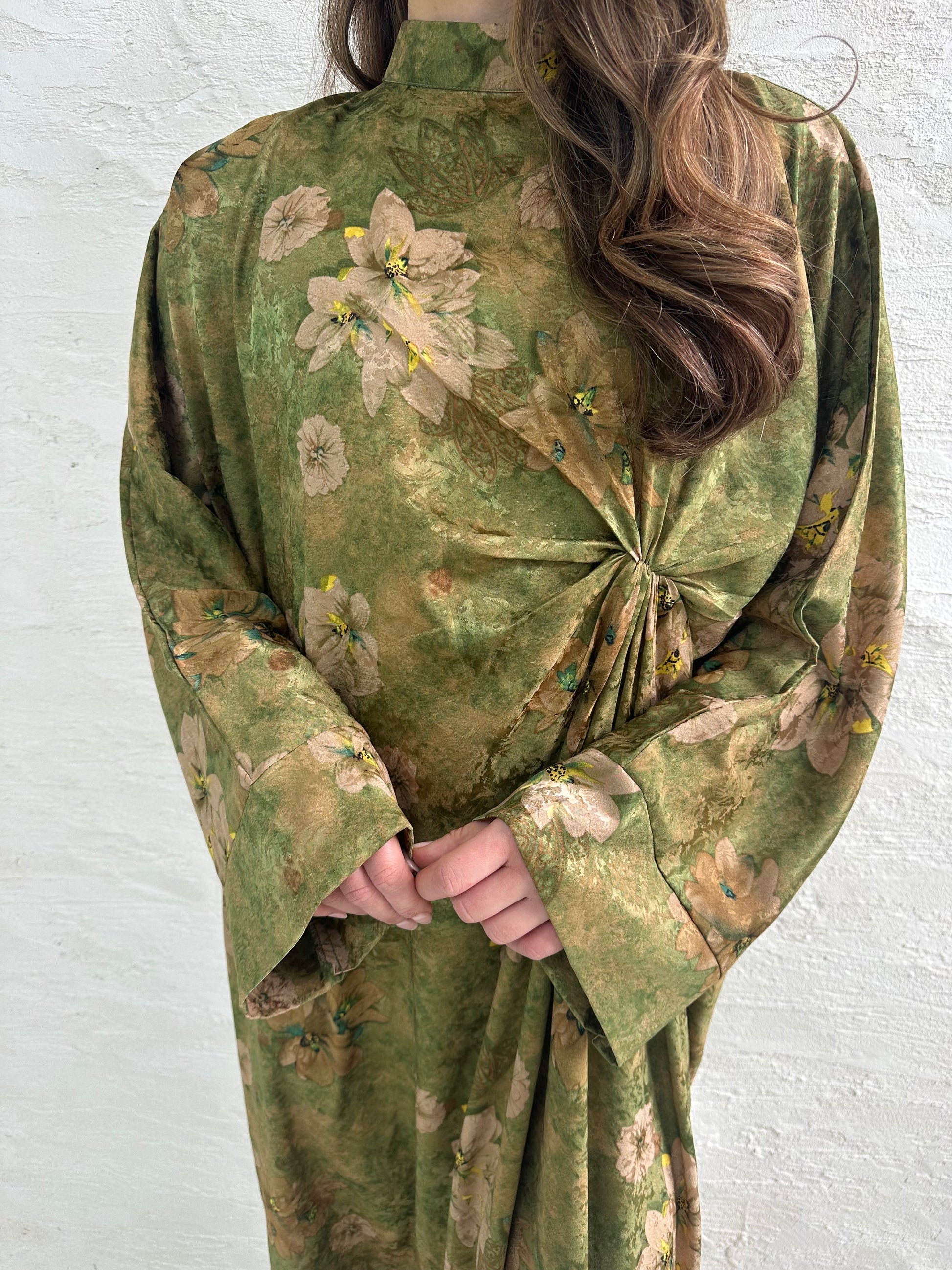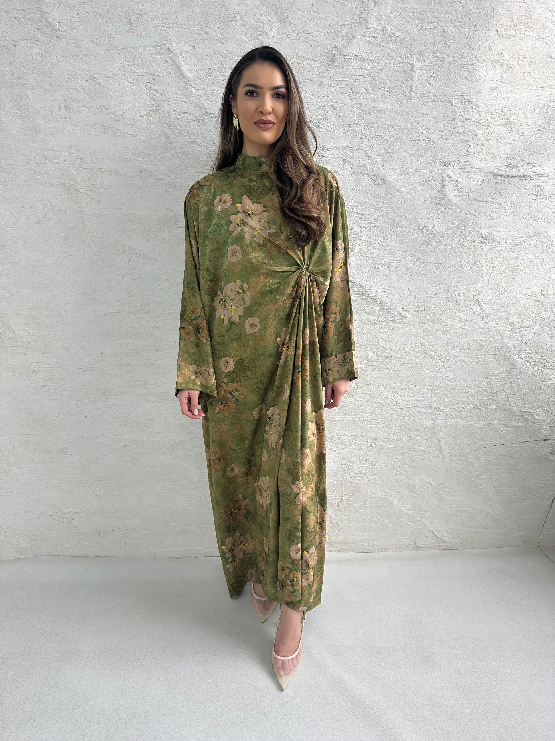 ● OLIVE GREEN PRINTED KNOT DRESS